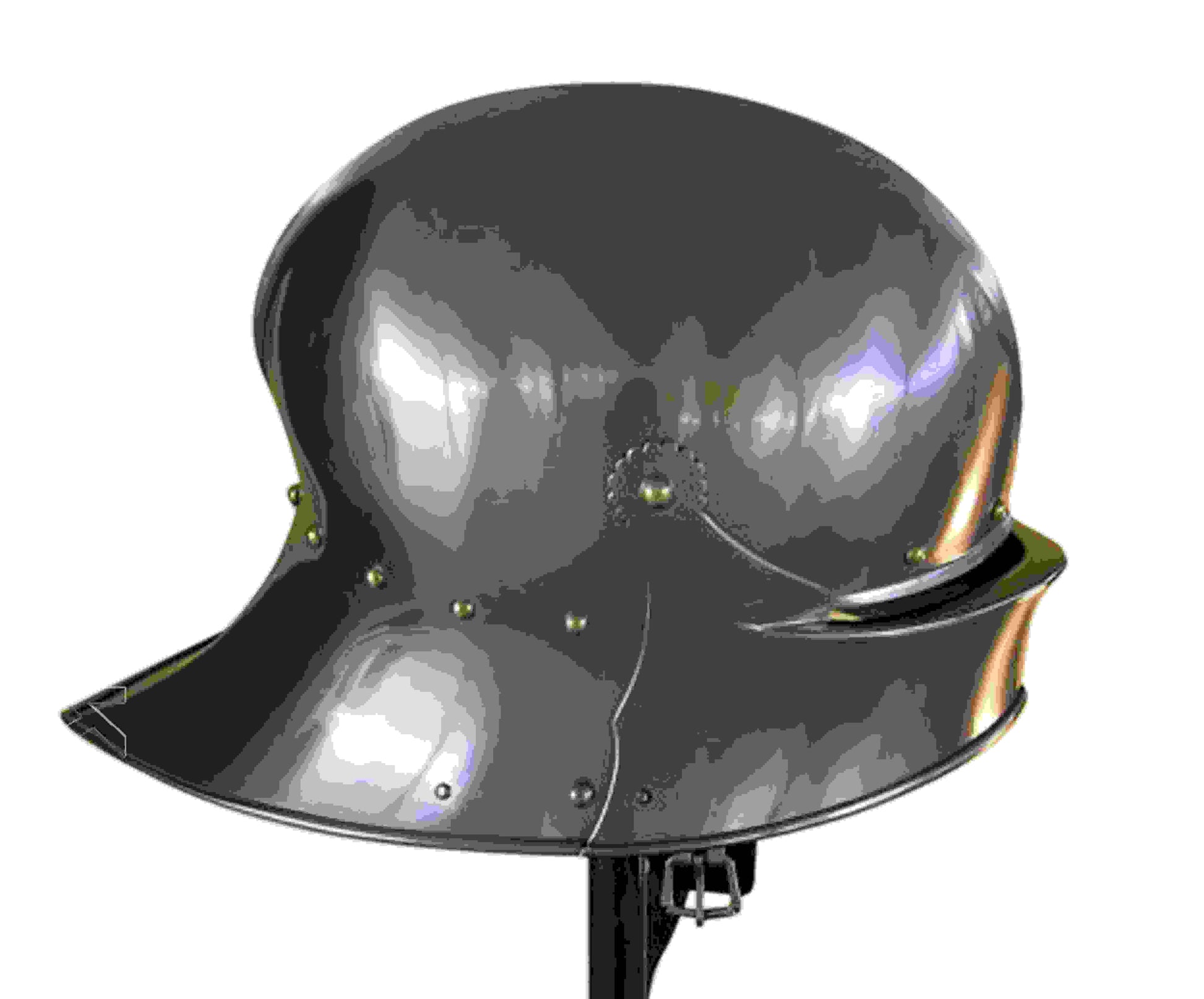 Medieval Knight Wearable German Sallet helmet Replica Sugar loaf 18GA SCA LARP Finish and it's easy to see why the sallet ended up becoming one of the more common helmets of the Middle Ages. / This particular sallet is modeled after the classic German Gothic style, / which gives it an elegant design that features attractive fluting and ridge work that enhances the look of the armour while also / reinforcing its strength. / The interior of the helmet features leather lining as well as an adjustable leather chin strap, / which is perfect for keeping the helmet secured and in-place when wearing it. / The helmet features a shiny metal finish that is perfect for creating a 'knight in shining armour' look, / and the helmet also pairs nicely with our other Gothic Armor sets thanks to its gleaming appearance,All Helmet are coated with rust-free paint from inside