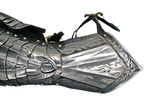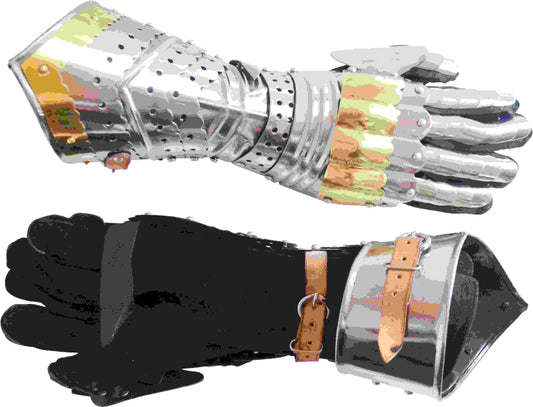 Medieval articulated gauntlets with brass work, silver finish, standard size